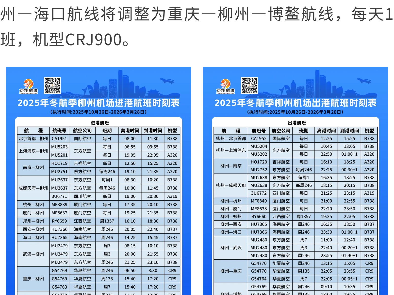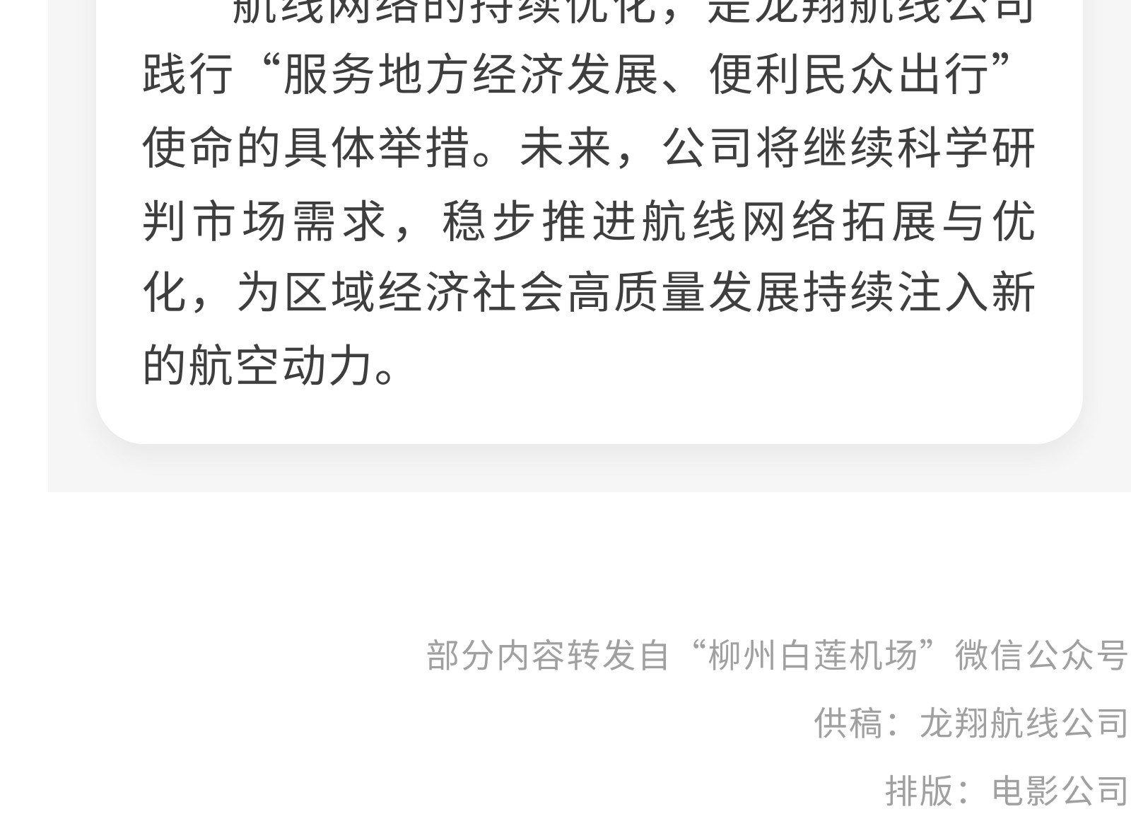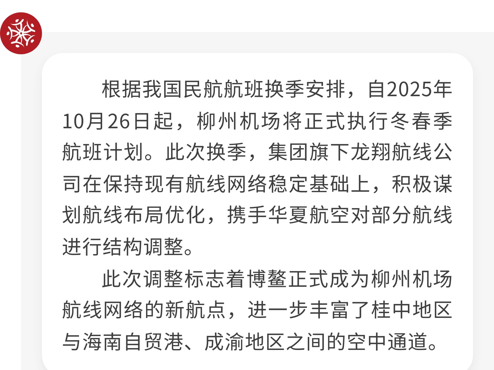 柳州又新增一航點!集團(tuán)旗下龍翔航線公司冬春航季持續(xù)織密航線網(wǎng)絡(luò) 發(fā)布時間:2025年10月17日 10時來源:本站原創(chuàng)瀏覽:106 人次
