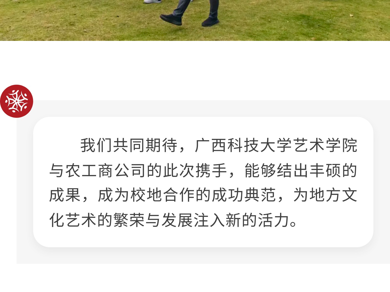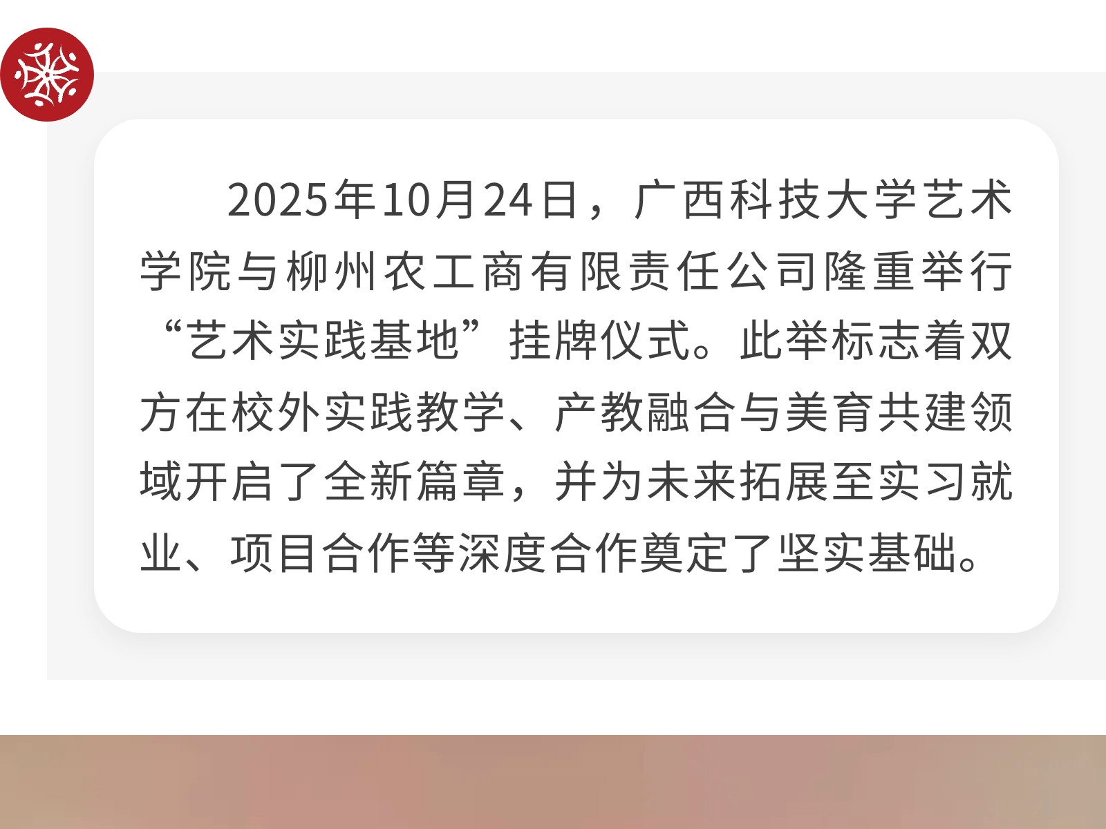 【校企攜手 共育英才】廣西科技大學藝術學院與柳州農工商公司正式簽署校企合作協(xié)議 發(fā)布時間:2025年11月02日 10時來源:本站原創(chuàng)瀏覽:52 人次